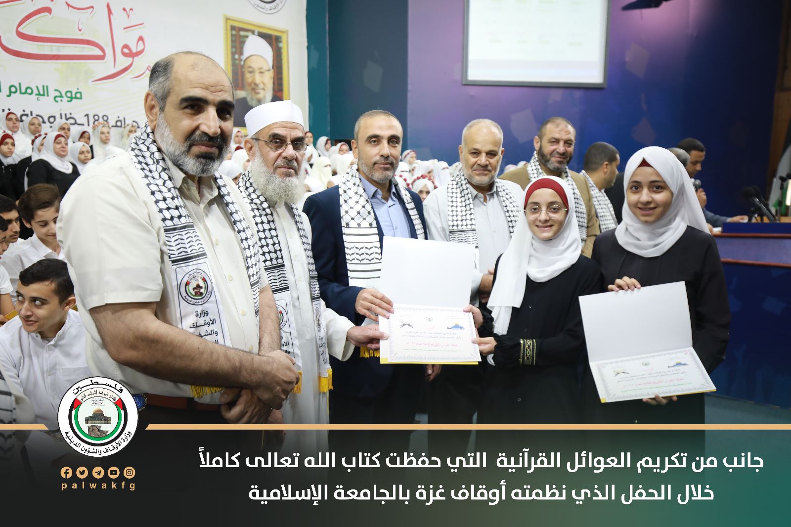كرمت مديرية أوقاف غزة 188 حافظًا وحافظةً لكتاب الله تعالي، أتموا حفظ القرآن الكريم خلال العام الحالي 1444هـ/2022م، وذلك خلال حفل مهيب نظمته بعنوان "مواكب النصر" فوج الإمام القرضاوي في قاعة المؤتمرات الكبرى بالجامعة الإسلامية، برعاية كريمة من جمعية البركة الجزائرية للعمل الخيري والإنساني.