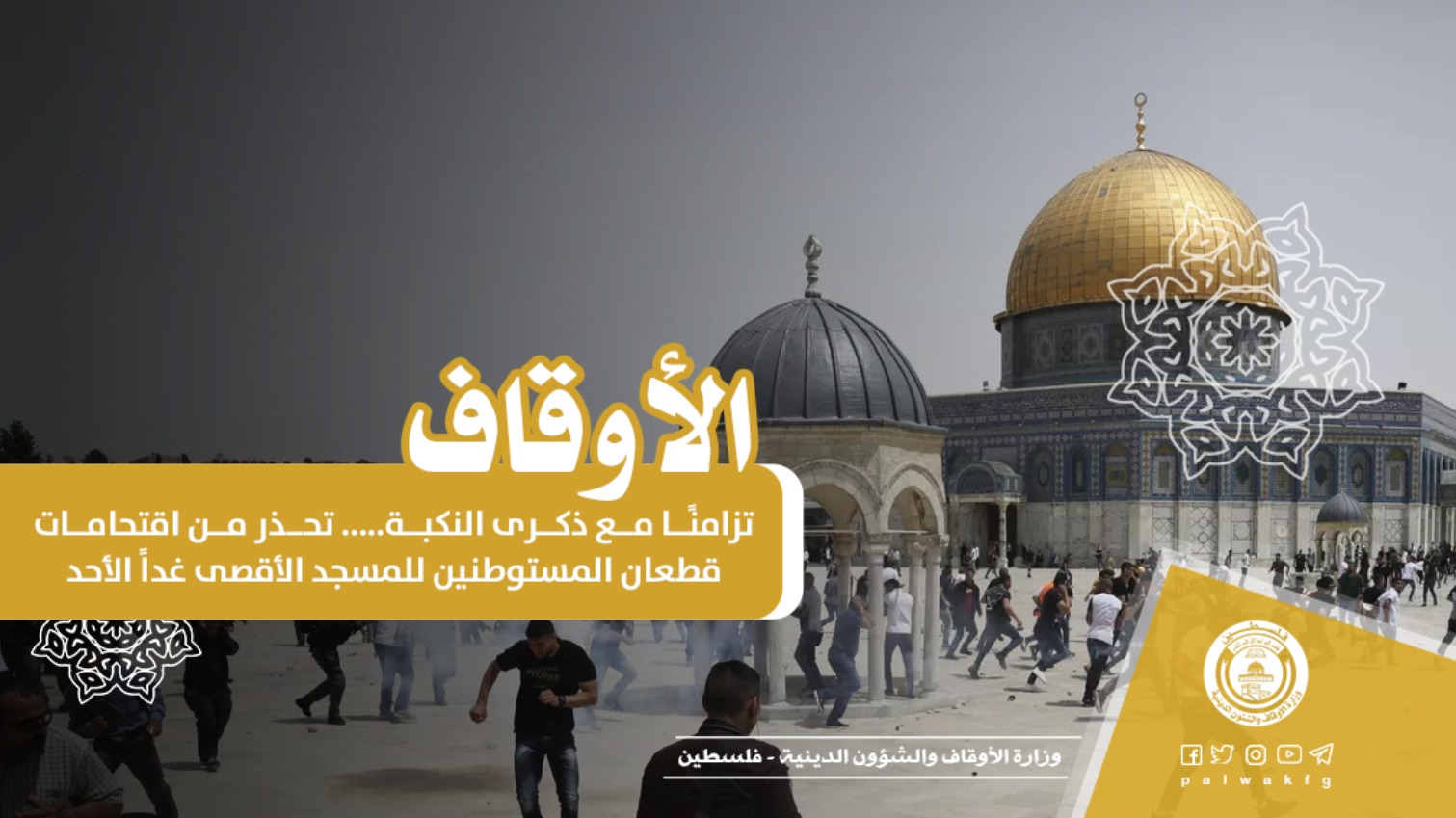 حذرت وزارة الأوقاف والشؤون الدينية من عزم قطعان المستوطنين المتطرفين ممن ينتسبون لما يسمى "جماعات الهيكل" اقتحام المسجد الأقصى المبارك يوم غدٍ الأحد تزامنًا مع ذكرى النكبة الفلسطينية في الخامس عشر من مايو، بمناسبة ما يسمى عندهم بعيد "الفصح الثاني".