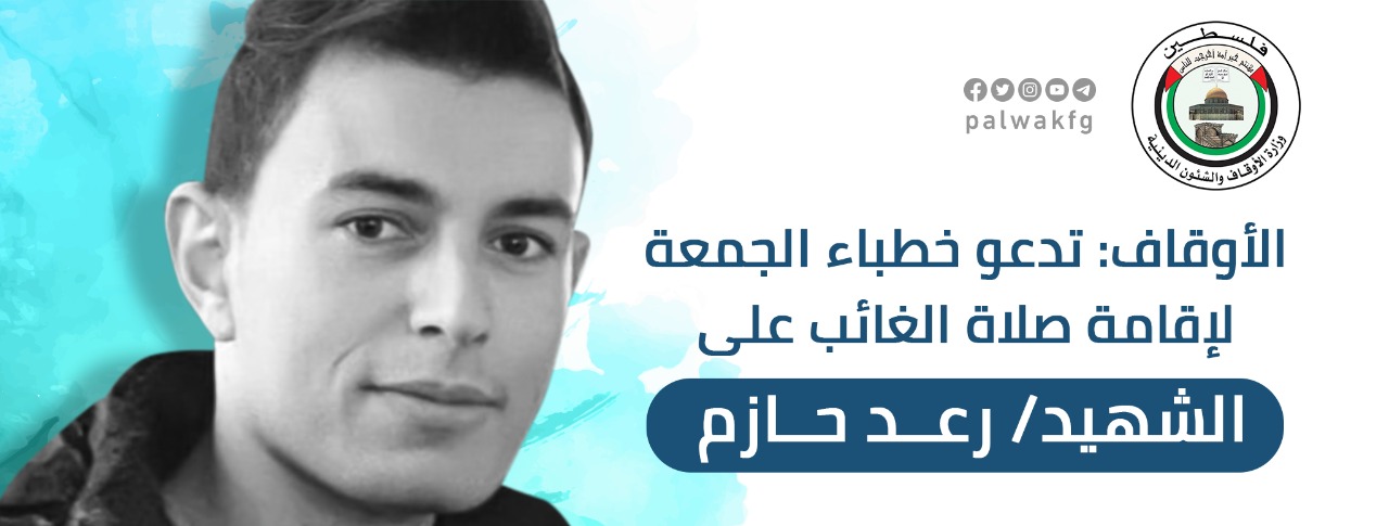 دعت وزارة الأوقاف والشؤون الدينية جميع خطبائها اليوم لأداء صلاة الغائب على الشهيد البطل رعد فتحي حازم, والذي استشهد عقب عملية بطولية نفذها في مدينة تل الربيع المحتلة, وذلك بعد صلاة الجمعة مباشرة في جميع مساجد قطاع غزة.