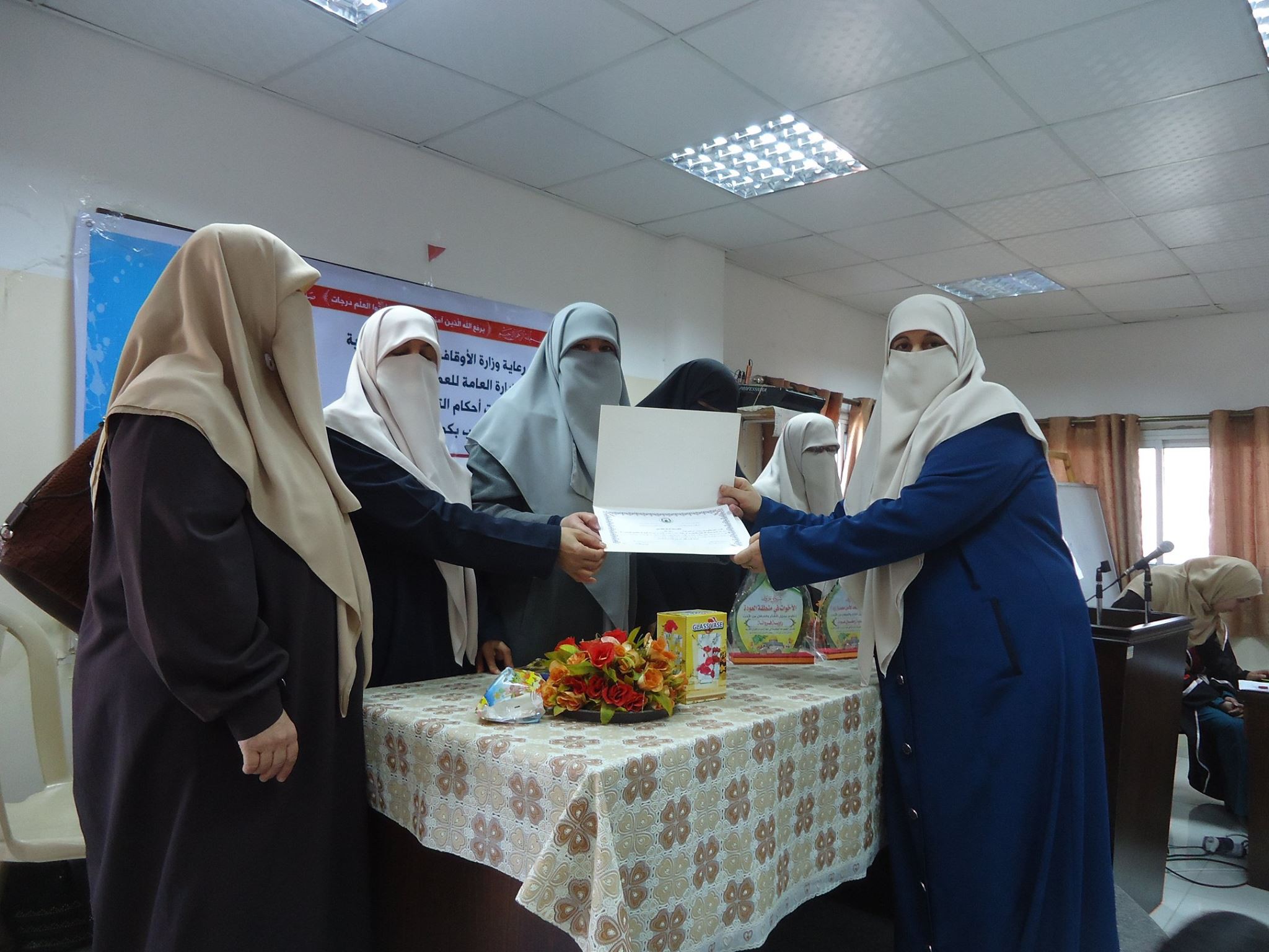 نظم قسم التلاوة والتجويد في الإدارة العامة للعمل النسائي حفل لتخريج المشاركات في دورات الأحكام والتلاوة والبالغ عددهن ثمانين طالبة في مركز عائشة الثقافي بمحافظة الشمال, حضره كل من رئيس القسم .أ.تغريد مريش والإداريات والمشرفتين إنعام الشرافي ونجاح المدهون ومدرسات الدورات أ.مجدية عودة و.أ. راوية فروانة.