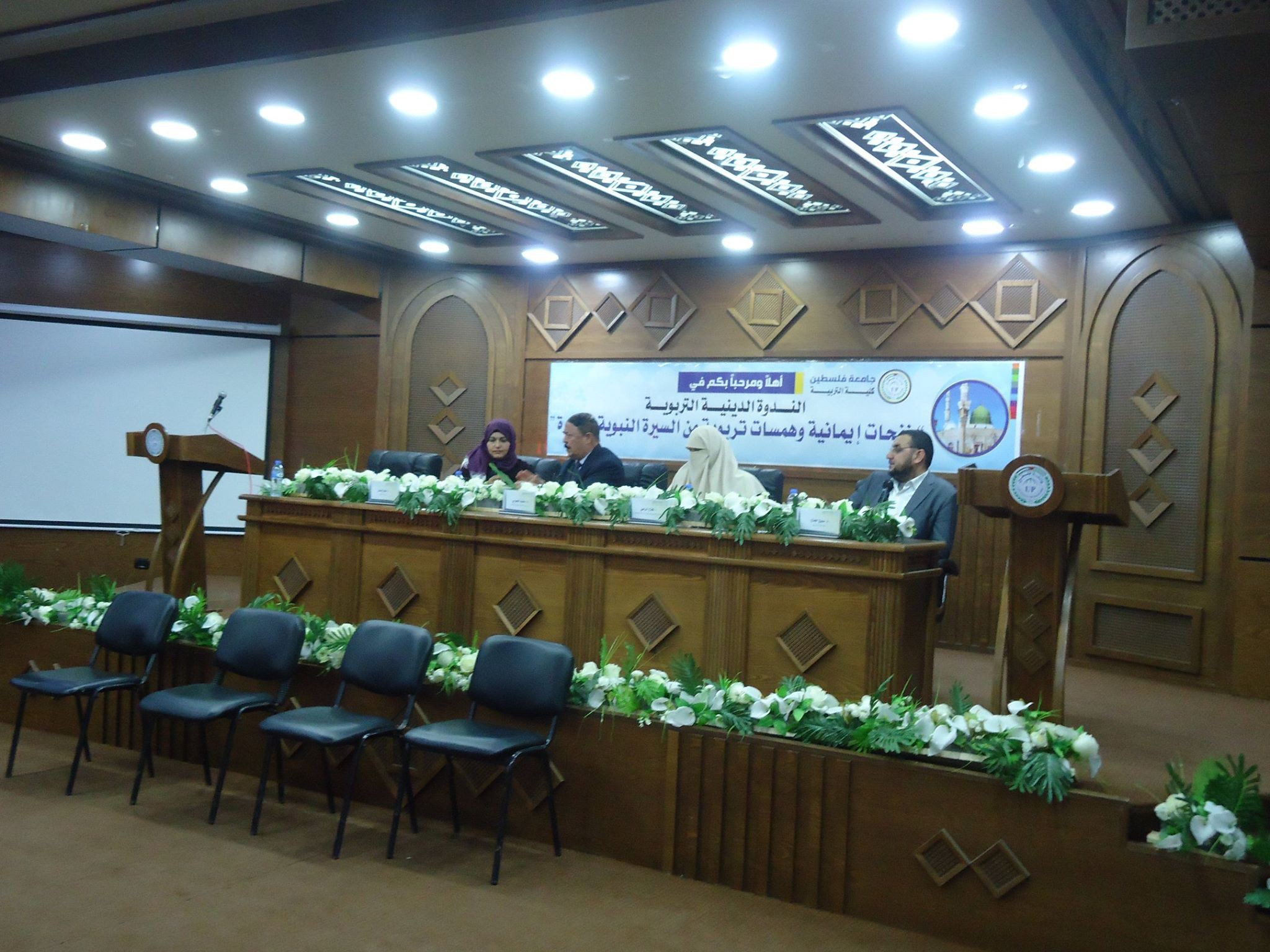 نظمت كلية التربية في جامعة فلسطين "ندوة تربوية "بعنوان نفحات إيمانية وهمسات تربوية من السيرة النبوية المعاصرة" بمناسبة ذكرى المولد النبوي الشريف, وشارك فيها عدد من الإداريين والمحاضرين ممثلة بالدكتور محمود العجرمي, و.د.سميح حجاج, و.د. صباح نصار وضيفة اللقاء .أ.كفاح الرملي, وفرقة متولي الشعراوي.