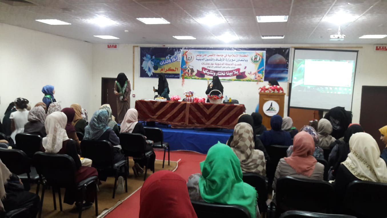 نظمت الواعظتين آيات دحلان وهدى ابو معنية ملتقى دعوي بالتنسيق مع طالبات الكتلة الإسلامية في جامعة الأقصى ضمن حملة نور وجنات التي تحمل عنوان :"يلا بنا نختار ونشيكها" , والتي استهدفت أكثر من مائة طالبة من كافة التخصصات المختلفة.