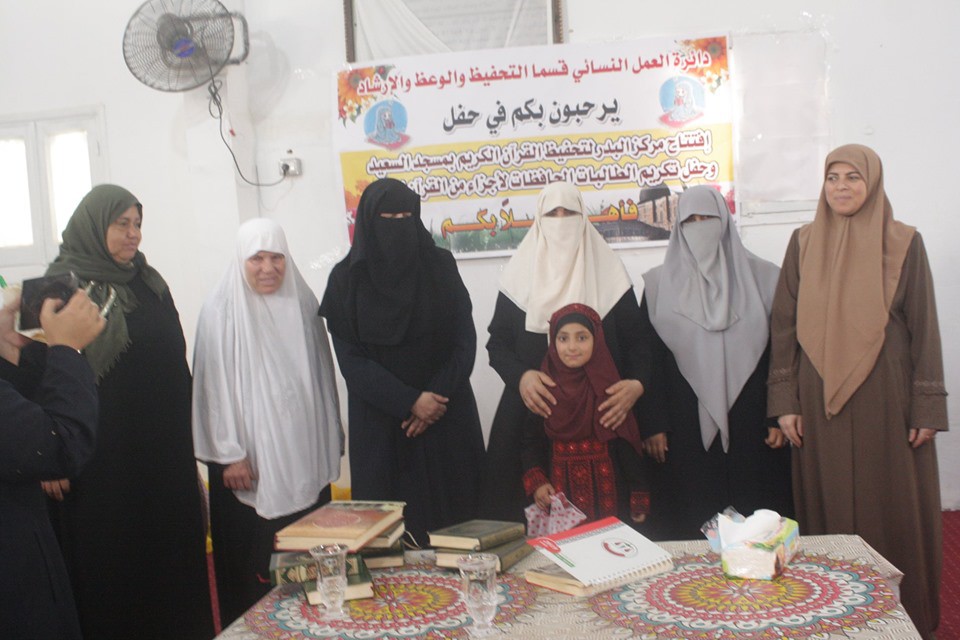 افتتحت الإدارة العامة للعمل النسائي مركز تحفيظ القرآن الكريم " حلقة بدر", وذلك بمسجد السعد بمحافظة خان يونس, الى جانب تكريم الطالبات الحافظات لأجزاء من القران الكريم بحضور المدير العام كفاح الرملي ومدير خان يونس حنان عدوان ومدير التدريب نادية الغول ومدير العمل النسائي مها الشوبكي, ولفيف من الحضور.