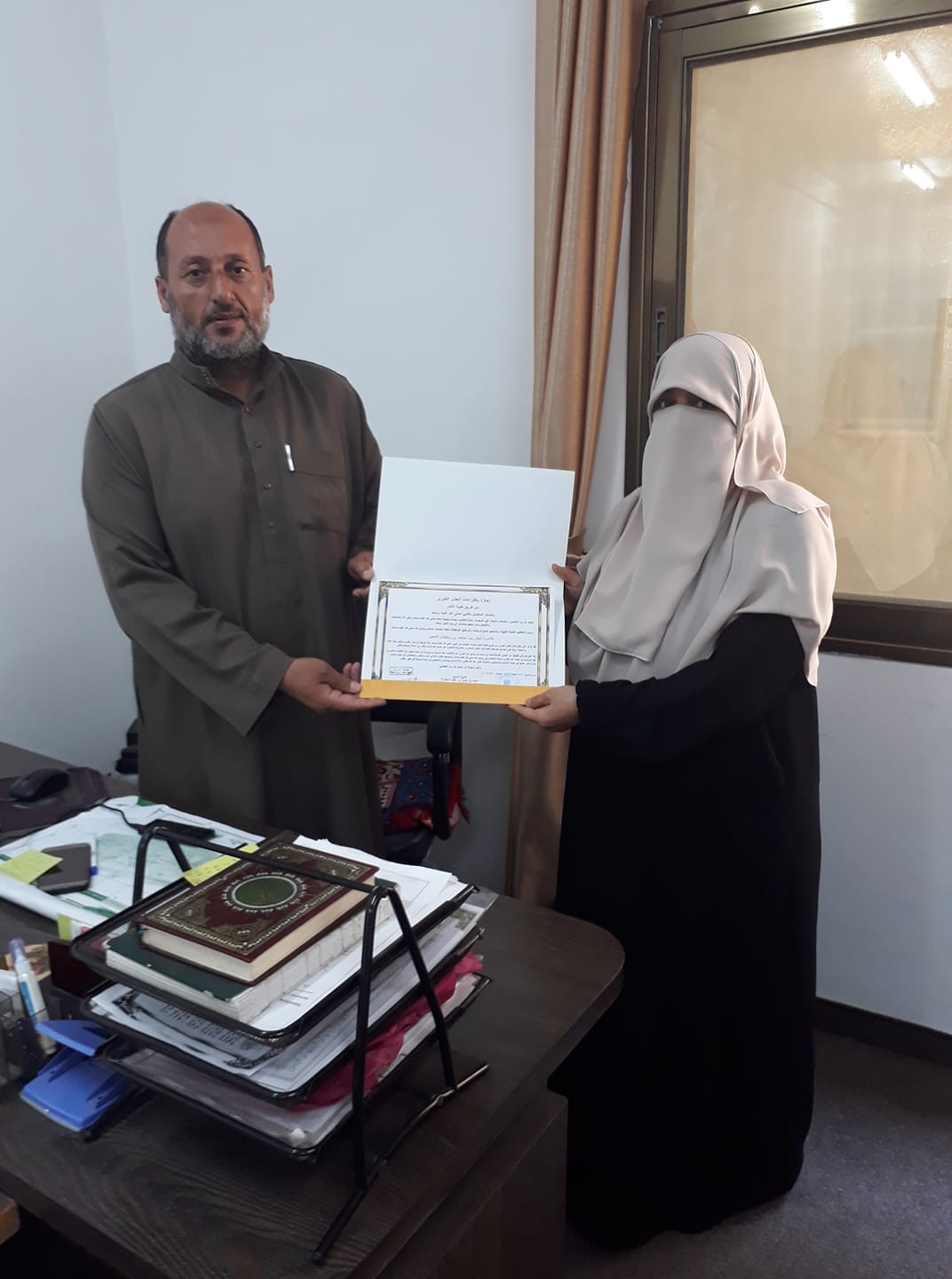 منحت مشيخة المقارئ التابعة لوزارة الأوقاف والشئون الدينية إجازة السند المتصل عن النبي صلى الله عليه وسلم بالقراءات العشر الصغرى والكبرى والزائدة عليها للطالبة آمل الخور بالقراءة والإقراء حسب القراءة المعتبرة لأهل العلم والأداء عن الشيخ المجيز/ محمد بن حسن حمدونة مدير دائرة مشيخة المقارئ الذي أوصىها بتقوى الله في السر والعلن والإخلاص في العلم والعمل.