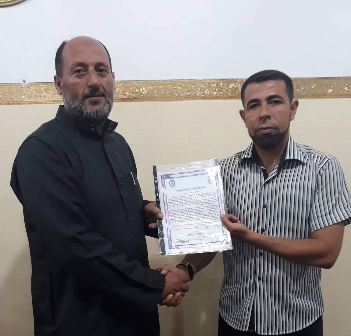 وقد تم إجازته عن الشيخ المجيز محمد حسن حمدونة مدير دائرة مشيخة المقارئ بالأوقاف، الذي أوصاه بتقوى الله في السر والعلن والإخلاص لله تعالى.