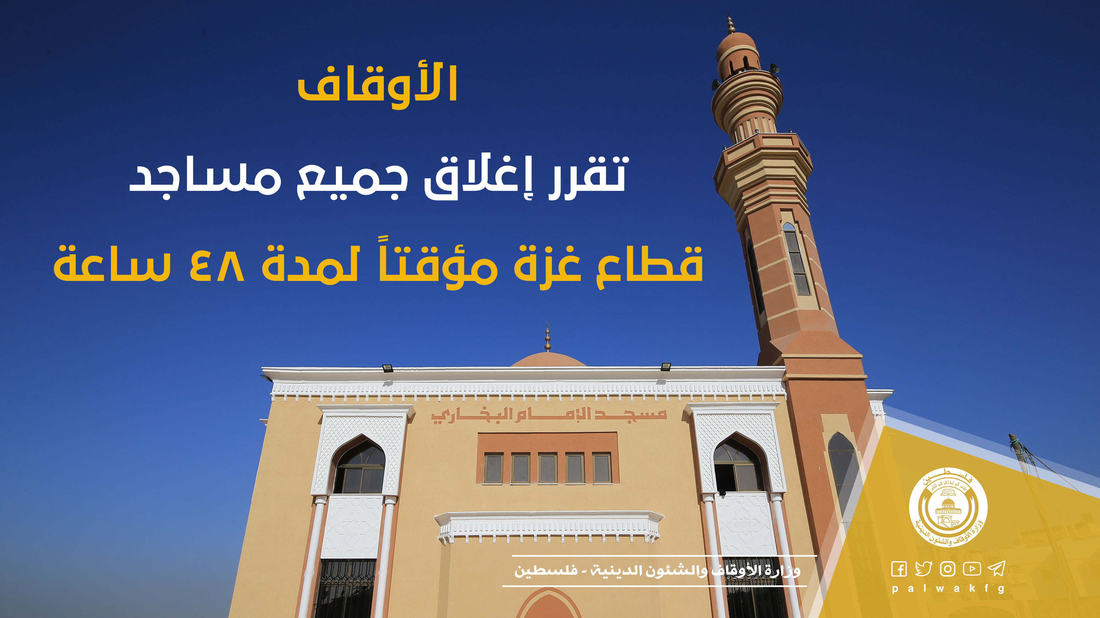 الأوقاف: بناء على مستجدات المرحلة الحالية تقرر إغلاقُ جميع مساجد قطاع غزة مؤقتاً، لمدة 48 ساعة ووقفُ صلوات الجماعة ابتداءً من فجر يوم الثلاثاء 25 أغسطس 2020م.