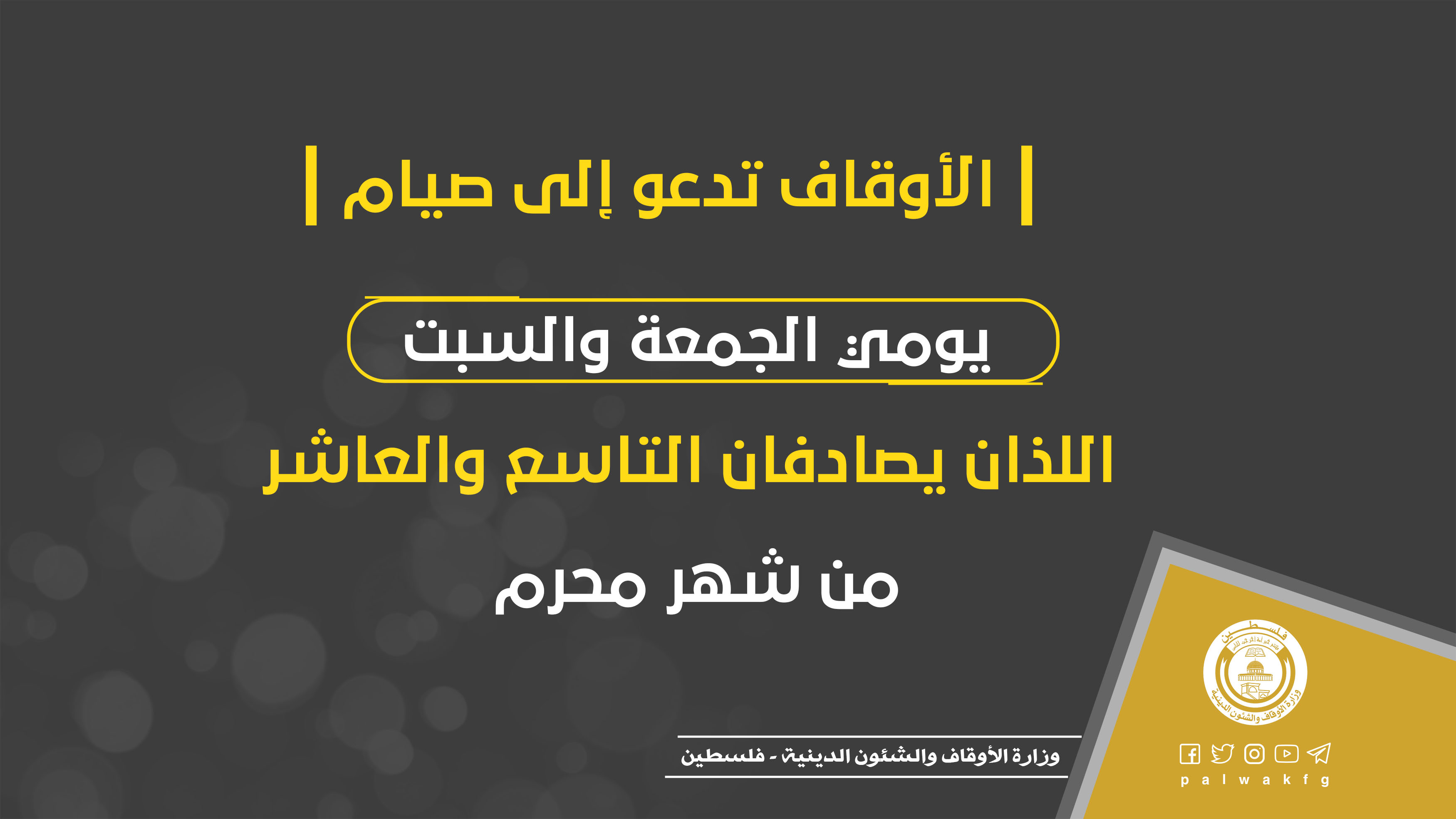 دعت وزارة الأوقاف والشؤون الدينة أبناء شعبنا الفلسطيني وجموع المسلمين إلى صيام يومي التاسع والعاشر من شهر محرم، واللذان يصادفان غدا الجمعة وبعد غدٍ السبت، وذلك إحياءً لسنة النبي صلى الله عليه وسلم واقتداءً به، وتقربًا إلى الله تعالى بأن يحفظ شعبنا والمسلمين من الوباء والبلاء.