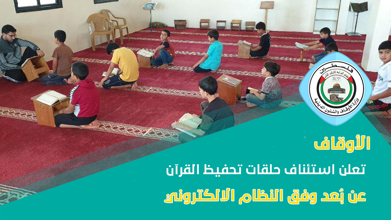 أعلنت وزارة الأوقاف والشؤون الدينية عن استئناف عمل حلقات تحفيظ القرآن الكريم عن بُعد وفق النظام الالكتروني عبر وسائل التواصل الالكترونية المتاحة اعتبارًا من صباح يوم غدٍ السبت الموافق 29 / 8 / 2020م.