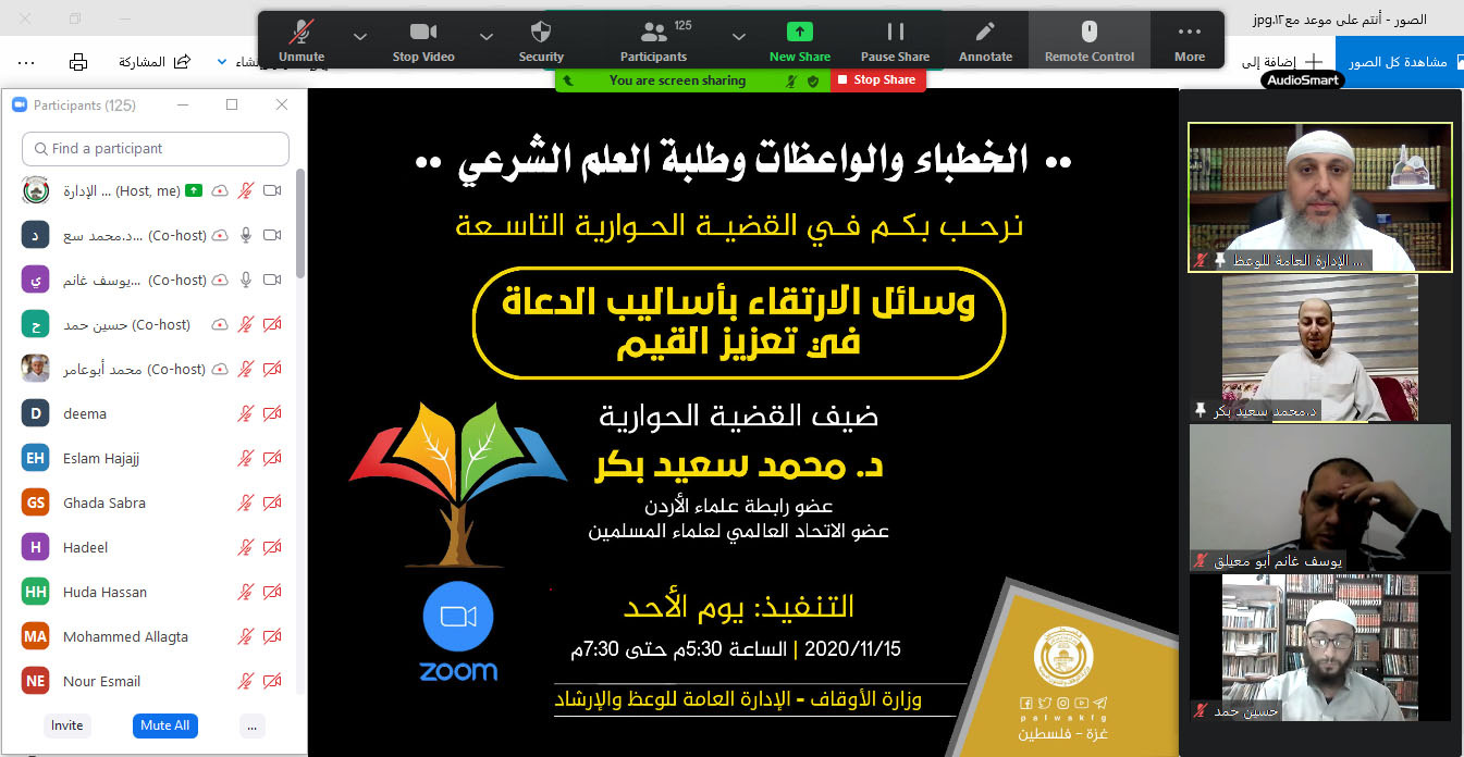 نظمت الإدارة العامة للوعظ والإرشاد بوزارة الأوقاف لقاءً حواريا بعنوان: "وسائل الارتقاء بأساليب الدعاة في تعزيز القيم"، استهدف الخطباء والواعظات وطلبة العلم عبر تطبيق zoom الالكتروني، بحضور ومشاركة مدير دائرة بحوث الدعوة أ. وفا عيّاد وعضو رابطة علماء الأردن د. محمد سعيد بكر.