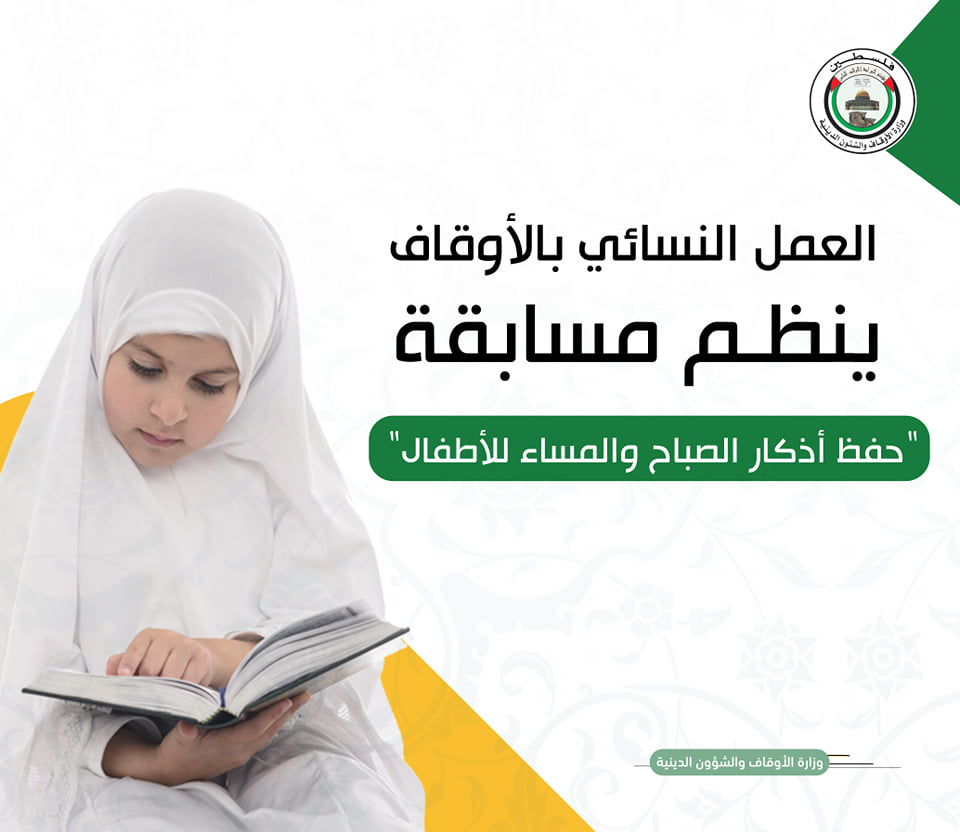 نظمت اللجنة الإلكترونية في الوعظ والإرشاد التابع للإدارة العامة للعمل النسائي بالأوقاف "مسابقة حفظ أذكار الصباح والمساء للأطفال" في محافظة خان يونس, وذلك ضمن مبادرة حصن الدنيا والآخرة التي أطقتها الادارة مؤخراً.
