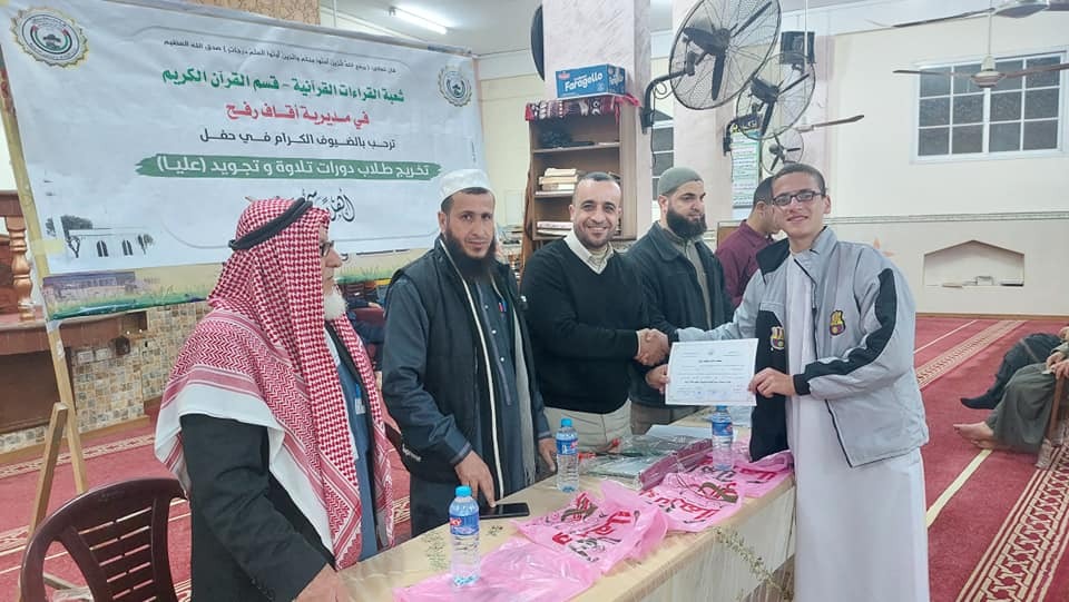 كرّم قسم تحفيظ القرآن الكريم بمديرية أوقاف رفح أكثر من 50 طالبًا شاركوا في عدة دورات أحكام تجويد القرآن (عليا)، وقام بتكريم مدرّسي الدورات في مسجد سعد بن معاذ في منطقة حي الجنينة، بحضور رئيس القسم د. علي المنشاوي، ومدرّسي مسجد سعد، وروّاده.