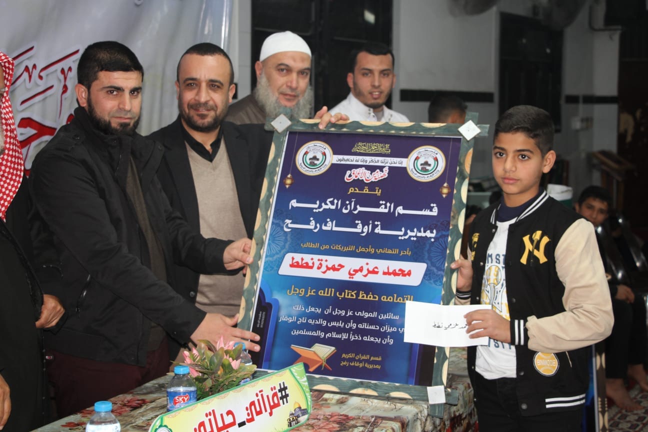 كرّم قسم القرآن الكريم بمديرية أوقاف رفح عددًا من حفظة كتاب الله، والمشاركين في دورات تأهيل السند، وذلك خلال حفل نظّمته في مسجد بلال بن رباح غرب المحافظة، بحضور مدير المديرية أ. محمد أبو عامر، ومدير ديوان الحفاظ أ. زياد أحمد، ولفيف من الشخصيات الاعتبارية والدينية، وذوي المحتفى بهم.
