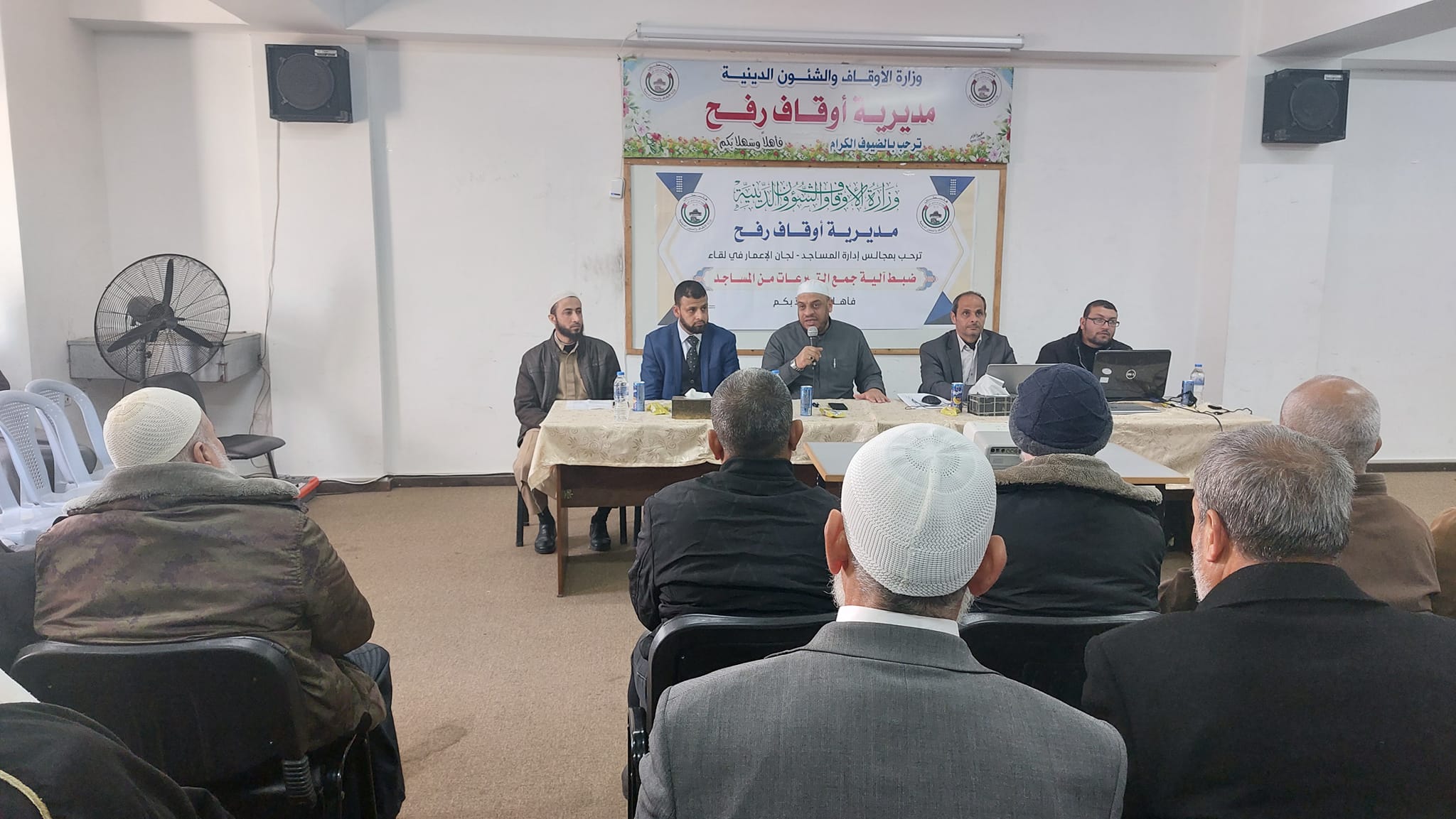 عقدت مديرية أوقاف رفح لقاءً خاصًّا مع مجالس إدارة المساجد ولجان الإعمار في المحافظة؛ وذلك لمناقشة آلية ضبط جمع التبرعات في المساجد، ودور اللجان في تعزيز مكانة المسجد في المجتمع، بحضور مدير أوقاف رفح أ. محمد أبو عامر، ورئيس قسم المساجد د. أحمد الزاملي، ومدير دائرة السياسات والتخطيط أ. محمود سعيد.
