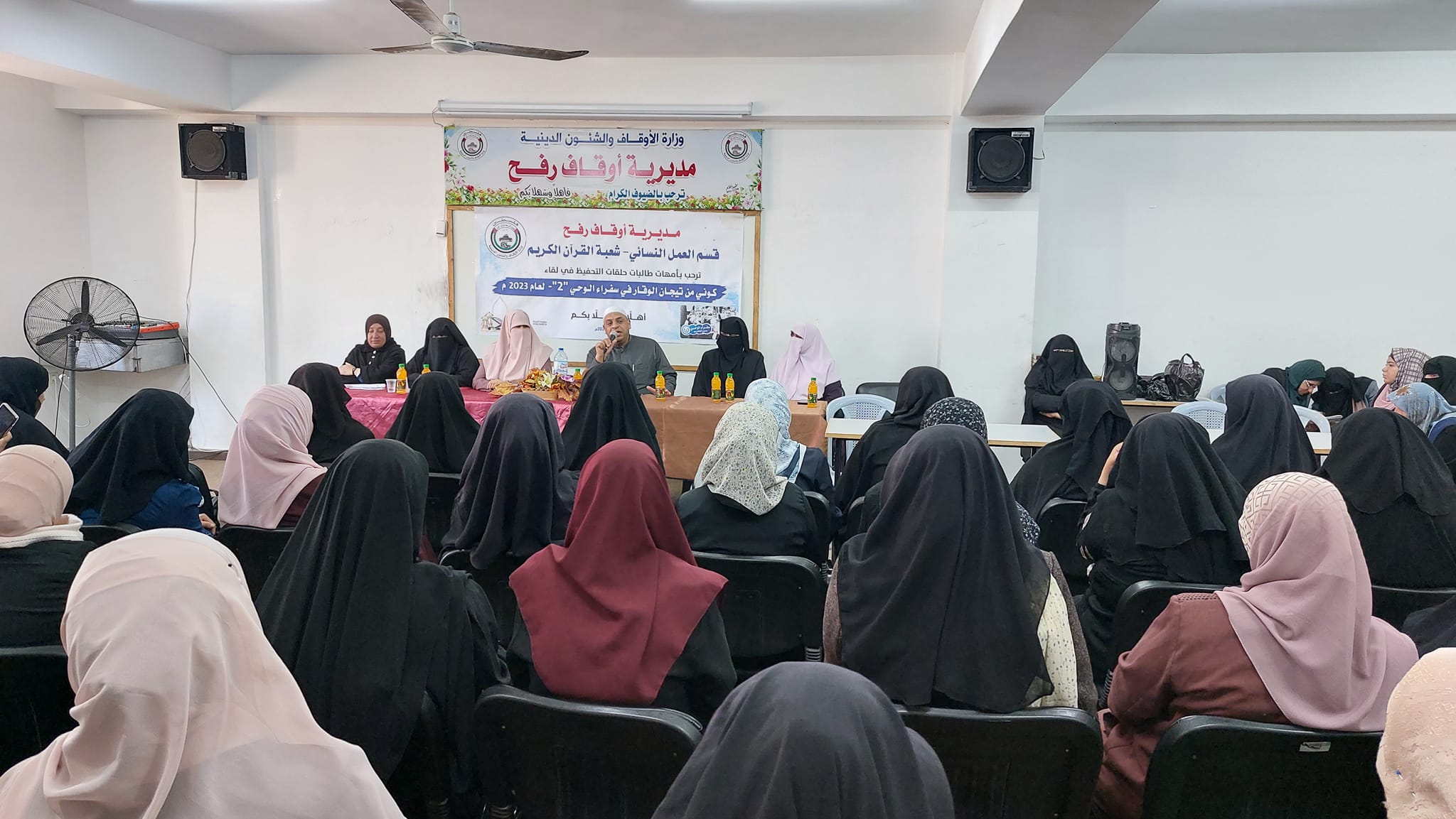 عقد قسم العمل النسائي بمديرية أوقاف رفح لقاءً مع أمهات طالبات مراكز القرآن الكريم، بعنوان (كوني من تيجان الوقار في سفراء الوحي)، وذلك في إطار التحفيز على تربية أبنائهن على موائد القرآن، بحضور مدير المديرية أ. محمد أبو عامر، ورئيس القسم أ. زمزم زعرب.