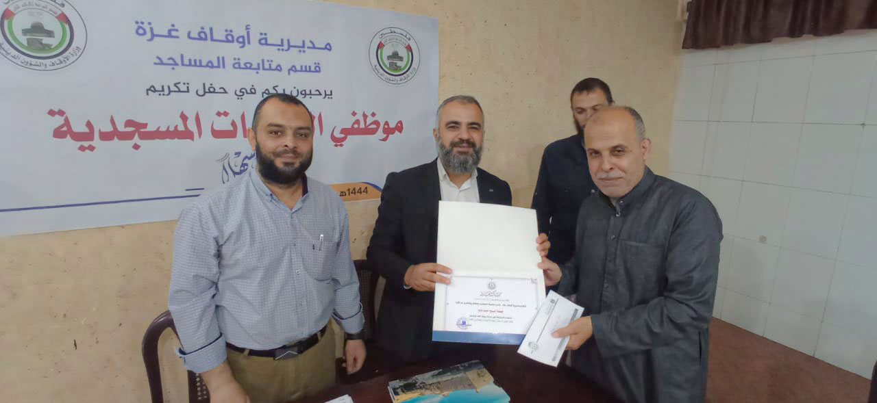 كرّم قسم متابعة المساجد في مديرية أوقاف غزة عددًا من موظفي الخدمات المسجدية، ومفتشي مجالس إدارة المساجد؛ تقديرًا لجهودهم وعطائهم طيلة الفترة الماضية، بحضور مدير المديرية م. محمد أبو سعدة، ورئيس قسم المساجد أ. محمد العجلة.