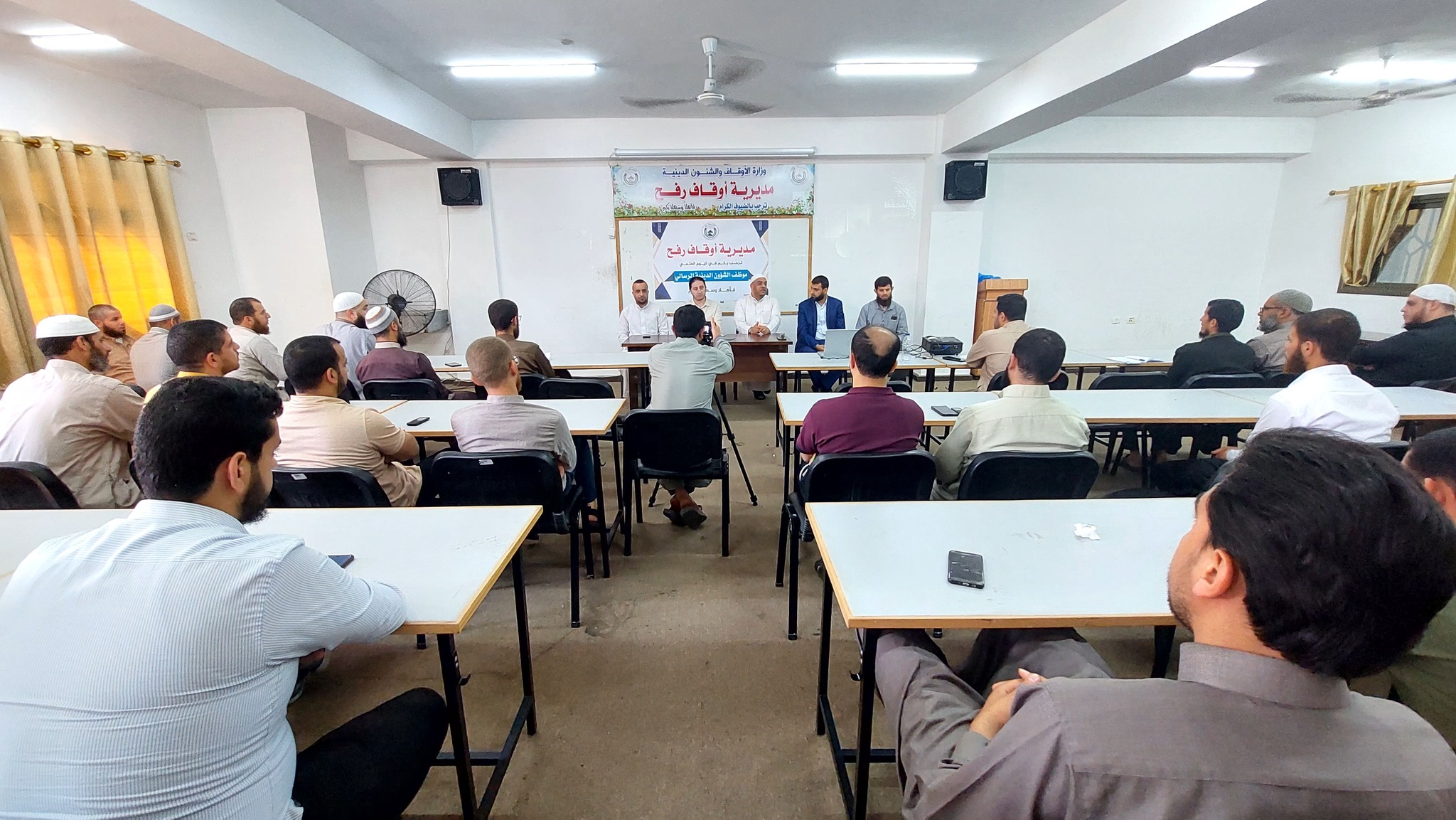 عقدت مديرية أوقاف رفح لقاءً علميًّا استهدف موظفي الشؤون الدينية، بعنوان (موظف الشؤون الدينية الرسالي)، بحضور مدير أوقاف رفح أ. محمد محمود أبو عامر، ورئيس قسم متابعة المساجد د. أحمد الزاملي، ورئيس قسم القرآن الكريم د. علي المنشاوي، ود. محمد المدهون من دائرة التدريب والتأهيل.