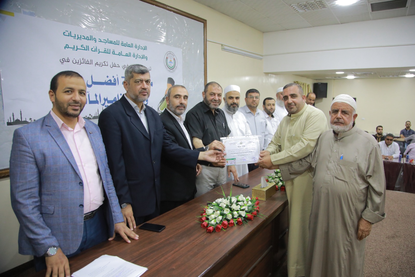 كرمت الإدارة العامة للمساجد والمديريات والإدارة العامة للقرآن الكريم بوزارة الأوقاف الفائزين في مسابقة أفضل مؤذن والحاصلين على دورة مزامير المآذن على مستوى محافظات قطاع غزة، وذلك خلال حفل نظمته في قاعة القدس بمقر الوزارة.