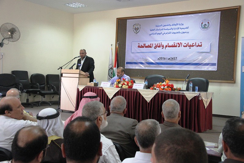 نظمت أكاديمية الإدارة والسياسة للدراسات العليا بالتعاون مع وزارة الأوقاف والشئون الدينية يوماً دراسياً بعنوان "تداعيات الانقسام وآفاق المصالحة" وذلك اليوم الاثنين في قاعة القدس بوزارة الأوقاف بحضور وكيل وزارة الأوقاف د.