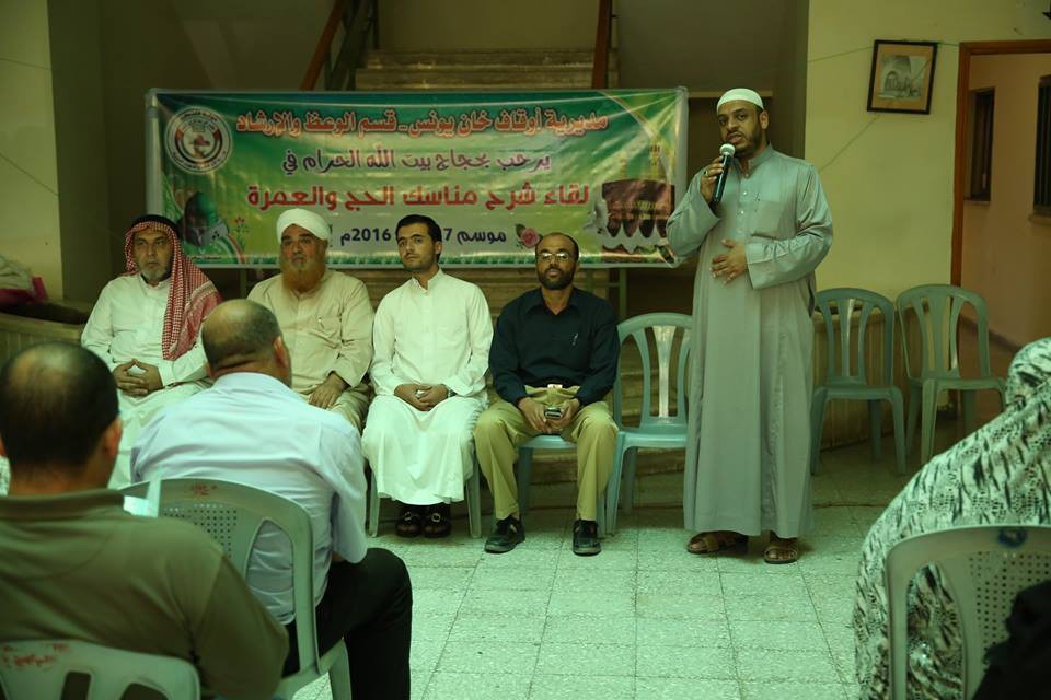 عقد قسم الوعظ والإرشاد بأوقاف خانيونس لقاء تعليمي لشرح مناسك الحج والعمرة لجميع حجاج المحافظة في مقر بلدية خانيونس بهدف توعيتهم وترسيخ المفاهيم المتعلقة بمناسك الحج والعمرة في أذهانهم وقلوبهم.