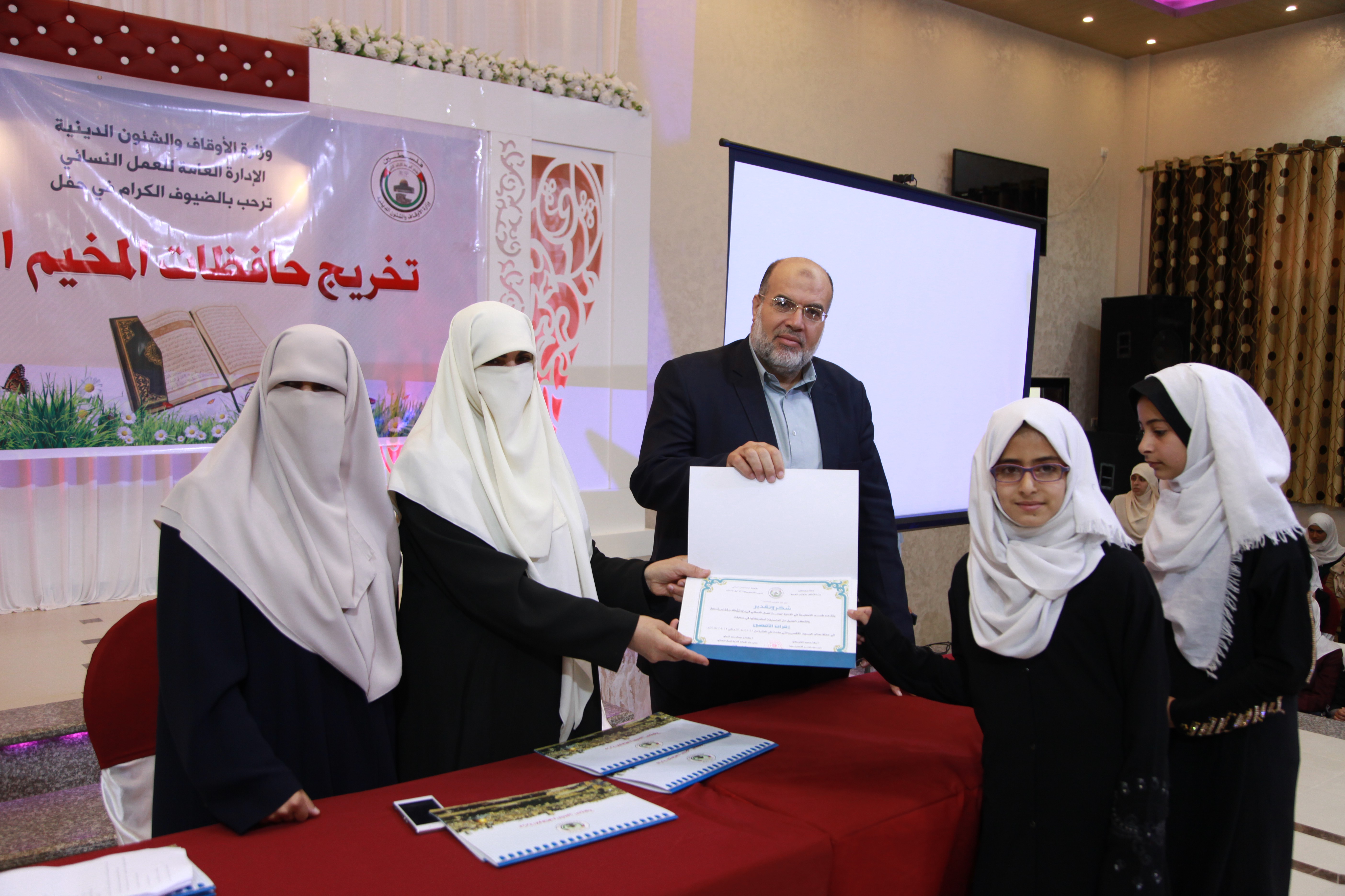 كرَّمت الإدارة العامة للعمل النسائي التابعة لوزارة الأوقاف والشئون الدينية الحافظات لكتاب الله في المخيم القرآني السادس والبالغ عددهن (107) حافظة, وذلك خلال حفل نظمته في قاعة فوريو بغزة بحضور ومشاركة مدير عام الشئون الإدارية بالأوقاف د. وليد عويضة ومدي
