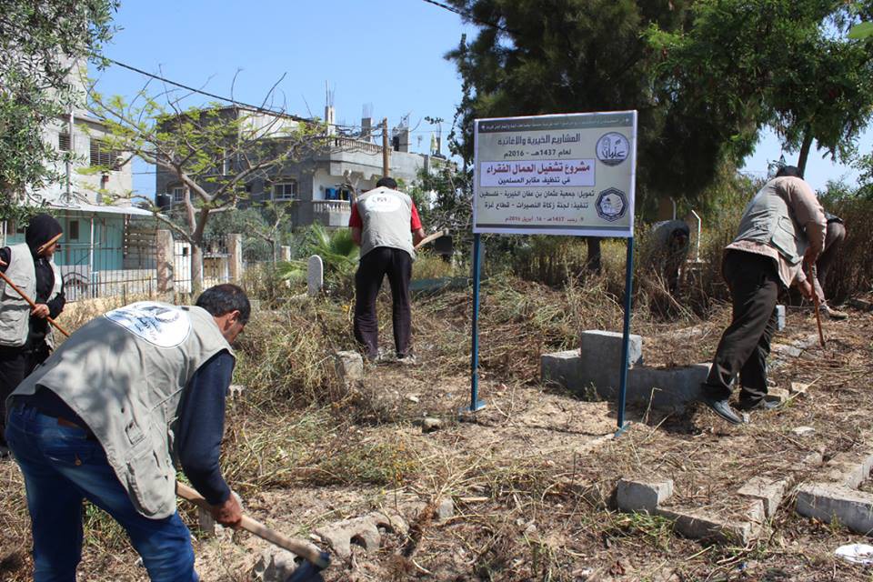 نفذت لجنة زكاة النصيرات مشروع تشغيل عشرات العمال الفقراء في تنظيف مقابر المسلمين كخطوة أولى ومتواضعة في تحدي البطالة والحصار ، وذلك بتمويل كريم من جمعية عثمان بن عفان الخيرية. بدوره قال مسئول قسم المشاريع في اللجنة أ.وف