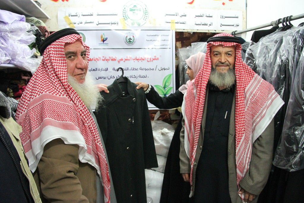 شرعت الإدارة العامة للزكاة التابعة لوزارة الأوقاف والشئون الدينية بتوزيع عدد (1000) جلباب على طالبات الجامعات الأشد فقرًا, بواقع (130) شيكل لكل جلباب وبتكلفة إجمالية (130000) شيكل, بتمويل كريم من مجموعة عطاء التطوعية. وفي كلمة له أوضح مدير الإد