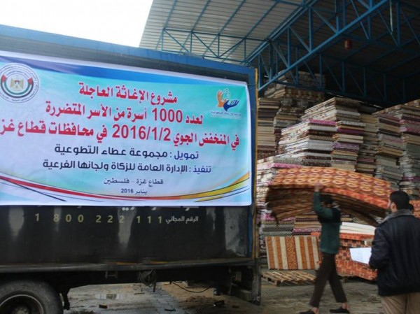 شرعت الإدارة العامة للجان الزكاة التابعة لوزارة الأوقاف والشئون الدينية بتقديم مساعدات إغاثية عاجلة لـ (1000) أسرة من الأسر التي تضررت نتيجة المنخفض الجوي من مختلف محافظات قطاع غزة بتكلفة إجمالية تزيد عن 50 ألف دولار بتمو