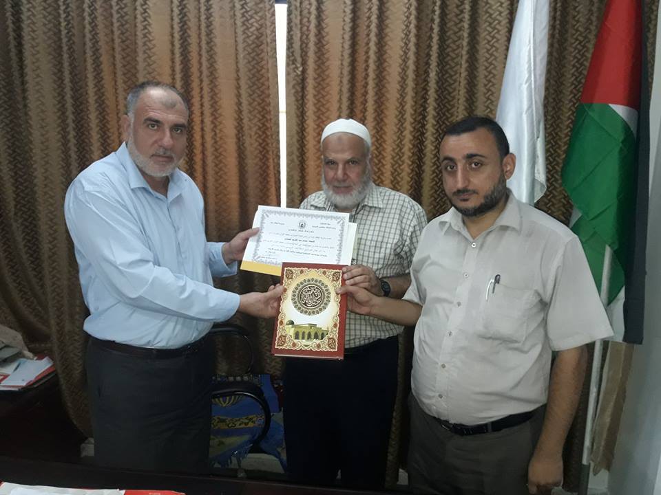 كرم مدير أوقاف غزة أ. سمير مسلم العاملين في لجان لاختبارات مسابقة الاقصى المحلية، شاركه في التكريم رئيس قسم التحفيظ أ. عبد اللطيف سالم.