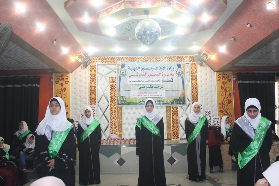 نظم قسم تحفيظ العمل النسائي في محافظة الشمال التابع لمسجد عباد الرحمن حفل تكريم للطالبات الحافظات للقرآن الكريم وأجزاء منه في صالة الأروينت بحضور مرشدات التحفيظ أسماء الملفوح وحنان حمودة وأمال المدهون والمحفظات ولفيف من ألياء الأمور وطالبات المراكز.