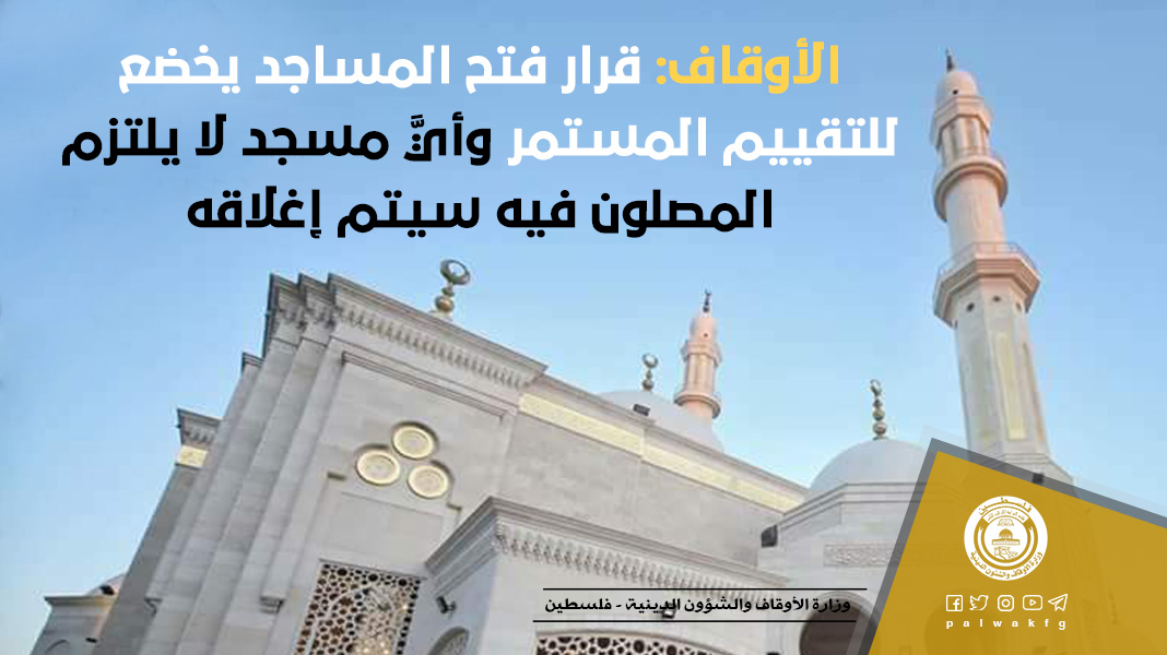 أكدت وزارة الأوقاف والشؤون الدينية أن قرار فتح المساجد في محافظات رفح وخانيونس والوسطى، يخضع للتقييم المستمر، وإن ديمومته متعلقة بالتزام المصلين بالتعليمات والإجراءات التي فُتحت المساجد على أساسها، وأيَّ مسجد لا يلتزم المصلون فيه سيتم إغلاقه.