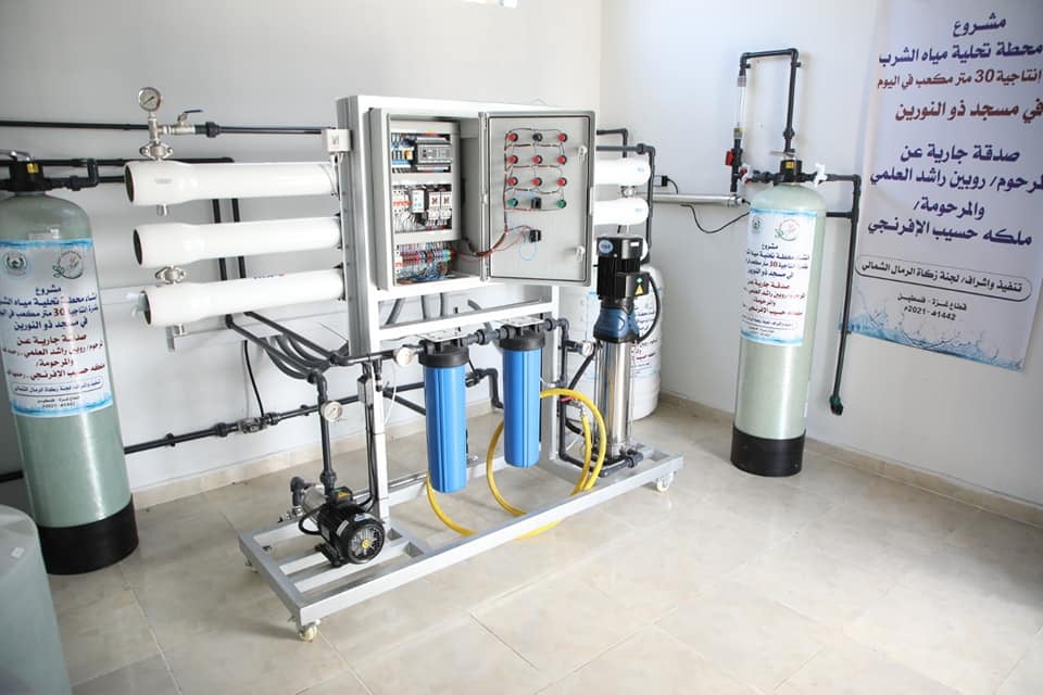 انتهت لجنة زكاة الرمال الشمالي التابعة للإدارة العامة للزكاة في وزارة الأوقاف والشئون الدينية, من تركيب وتشغيل ( 5 ) محطات تحلية مياه في مساجد مختلفة في مدينة غزة بتكلفة ( 65 ) ألف دولار, بتمويل كريم من فاعلي الخير.