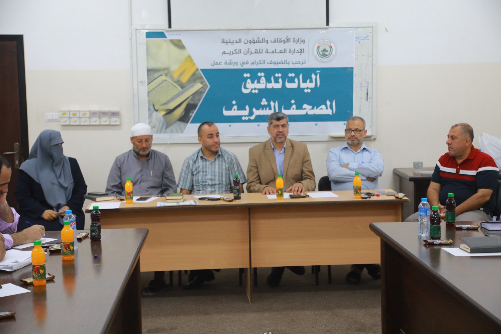عقدت الادارة العامة للقرآن الكريم بوزارة الأوقاف والشؤون الدينية ورشة عمل لبحث آليات وطرق تدقيق المصحف الشريف بمشاركة وكيل الوزارة د. عبد الهادي الأغا و مدير عام القرآن الكريم د. محمد سالم ومدراء الدوائر ورؤساء الأقسام في الادارة العامة ومديريات الأوقاف ولفيف من المختصين في القرآن الكريم وعلومه.