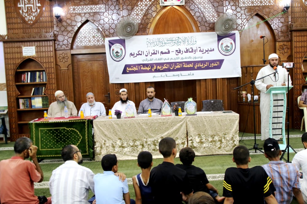 عقد قسم القرآن الكريم بمديرية أوقاف رفح لقاءً قرآنياً بعنوان " الدور الريادي لحملة القرآن الكريم في نهضة المجتمع" بمسجد نظام خالد غرب المحافظة، تهدف لشحذ همم المصلين نحو تلاوة وحفظ القرآن الكريم, بحضور رئيس القسم أ. علي المنشاوي، والداعية د. أنور الغوطي ولفيف من الدعاة.