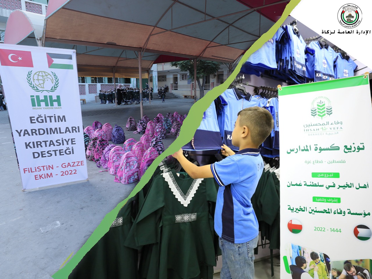 وزعت الإدارة العامة للزكاة بوزارة الأوقاف والشؤون الدينية حقائب وقرطاسية مدرسية استفاد منها 1700 طالب، بتكلفة (11,943) شيكل، بتمويل كريم من مؤسسة الإغاثة الإنسانية، وكسوة مدارس لعدد (99) أسرة بتكلفة إجمالية (6,930) شيكل, بتمويل كريم من مؤسسة وفاء المحسنين الخيرية.