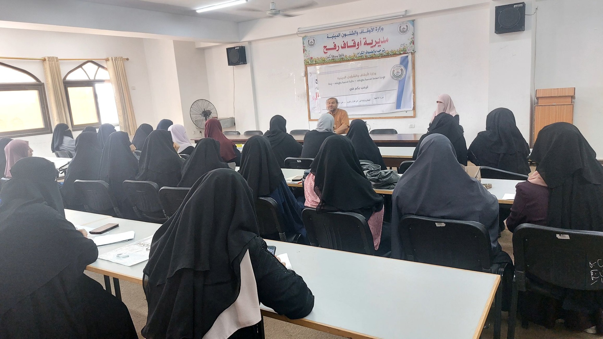 افتتح قسم الدعوة والإرشاد/ إناث بمديرية أوقاف رفح دورة علمية لموظفاتها في الإعجاز البياني والبلاغي في القرآن الكريم، بحضور مدير أوقاف رفح أ. محمد أبو عامر، ورئيس قسم العمل النسائي أ. زمزم زعرب، ومشرفة الدعوة والإرشاد أ. صباح نوفل.